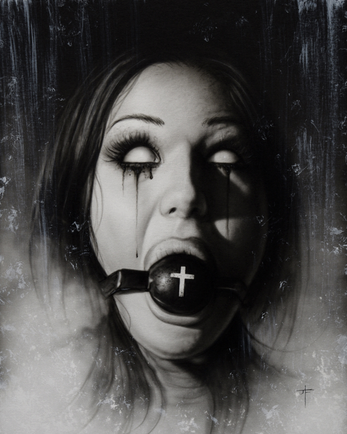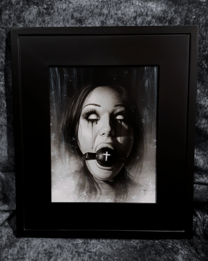 A study of pleasure and pain. Airbush and inks on wood panel. Finished in satin varnish and cradled in a matte black frame.